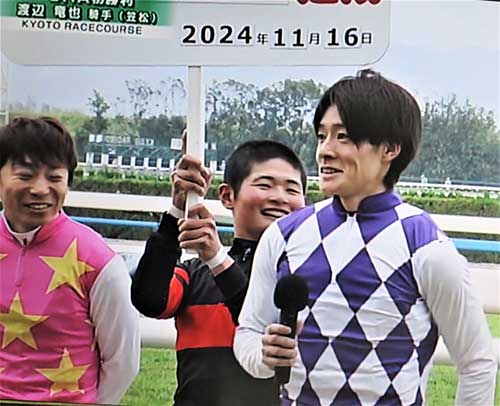 「抜けた、笠松の渡辺竜也騎手これがうれしいJRA初勝利」とレース実況。こちらも芦毛馬での歓喜。土曜日の京都競馬場はこの日一番の盛り上がりとなった。
