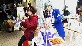 ウマ娘のコスプレ仲間。ビールや串カツを手に、昭和レトロ感が漂う笠松競馬場での一日を満喫したスタ...