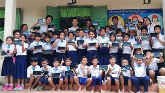 タブレット端末で勉強するカンボジアの子どもたち=同国「カンボジア・教育」というと皆...