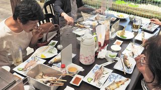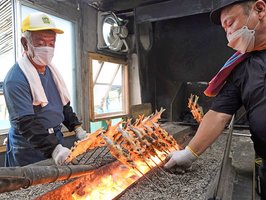 鮎の塩焼き炭火でじっくり 川口やな今季営業開始、岐阜・揖斐川町