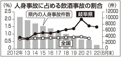 飲酒事故割合、岐阜県内で高水準続く 昨年は全国の2倍、通報窓口開設 社会 2022年7月24日 09:26 飲酒運転を取り締まろうと県警が県内全警察署管内で一斉に実施した検問=15日、羽島市正木町坂丸 岐阜県内の人身事故に占める飲酒事... 残り667文字(全文:684文字) この記事をお読みいただくには「デジタルプラン」または「宅配+デジタルプラン」の会員登録が必要です。無料会員の方はログインしてマイページからコース変更してください。デジタルプランまたは宅配+デジタルプランをご登録中の方はログインしてください。 岐阜新聞デジタル会員に登録すると 無料会員向け記事が読める ニュースレターで最新情報が受け取れる デジタルプラン、宅配+デジタルプランなら Webオリジナルコンテンツが読める 紙面ビューアが読める チケットの先行発売に参加できる お得なクーポンが使える 新規登録ページ ログインページ トップ 岐阜のニュース 社会 飲酒事故割合、岐阜県内で高水準続く 昨年は全国の2倍、通報窓口開設 関連記事 アルコールチェック義務化、検知器は在庫乏しく 10月から検知器必須 通勤で運転中「スマホは禁止」ドライバーに安全運転呼びかけ 「措置入院」通報9割が診察に至らず 保健所調査止まり、岐阜県 岐阜県内各地で積雪、飛騨市神岡町では25センチ 岐阜市、今季一番の寒さ おすすめ記事 【名将流儀】センター返しこそ真理 岐阜大会安打数記録チームをどう育てたか 太田郁夫さん【ぎふ高校野球】 勤務先の高校トイレで盗撮容疑、40代教諭を逮捕 岐阜羽島署 岐阜県内各地で積雪、飛騨市神岡町では25センチ 岐阜市、今季一番の寒さ 国政に物おじせぬ言動【岐阜市長2期目 柴橋正直氏の現在地】(上)政治家として