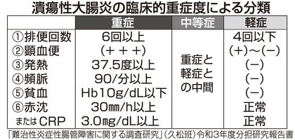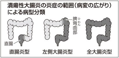 診断は大腸内視鏡検査で行いますが、病変の広がりによって直腸炎型、左側大腸炎型、全大腸炎型などに分類されます=図=。また重症度は自覚症状によって軽症、中等症、重症に分類されます=表=。軽症と中等症で全体の約80%を占め多くは内科的治療の対象ですが、重症では全大腸の外科的切除が必要になることもあります。
