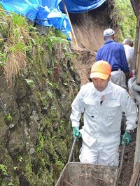 豪雨の影響で石垣崩壊、住民ボランティアが応急作業 岐阜・揖斐川町