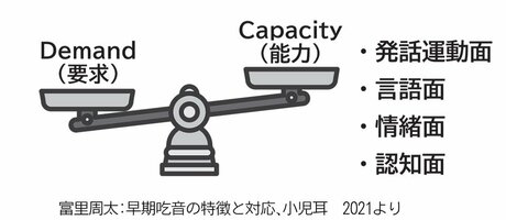 吃音の原因は大きく発達性、神経原性、心因性、薬剤性に分けられますが、子どもの吃音の多くは発達性吃音と考えられています。これは幼児期になり、ある程度言葉が話せるようになっても、長い単語や文の発話などでは、言語的負荷が高くなります。このような発話欲求に比べて言語能力や遂行機能の発達が不十分なことが関与しているためです。さらに興奮やストレスのある状況で吃音の症状が出やすくなります。すなわち幼児においては発話へのDemand(要求)と幼児のCapacity(能力)のバランスが悪いため、吃音が生じるとされています。