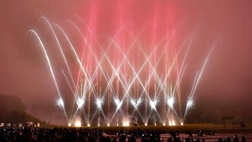 霧の高原、光と音の幻想花火ショー 岐阜・郡上市