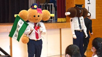 たれみちゃん初勤務、兄「御用の五平」と交安啓発 岐阜・中津川署の五平餅モチーフキャラ