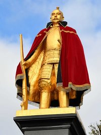 黄金の信長像も「キムタクフィーバー」期間限定で赤マント着用 JR岐阜駅前