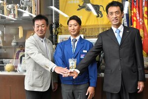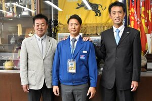 巨人にドラフト5位指名・西濃運輸船迫選手 水野雄仁スカウト部長と木佐貫洋担当スカウトが指名あいさつ