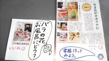 新聞記事の中から、心が温かくなる記事や関心のある記事を集めてコメントを簡単に書くとよいと思います。かわいいイラスト、美しい季節の写真などを、自由にコラージュのように貼り付けてもいいです。自分だけの宝物ノートにしてもいいですね。