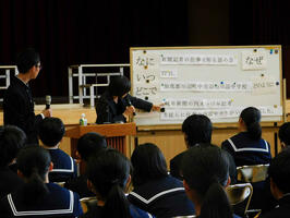 講演会は2部構成で行われた。第1部は新聞記者の仕事や新聞の記事、紙面構成について説明があった。第2部は、内木記者が会見される人、生徒が会見する人と役割分担をし、「模擬会見」を行った。第1部で、生徒にとって印象深かった一つは、記事が「5W1H」で書かれている点。「5W1H」の意味を教わると、「そうなんだ」「へえ」という声が聞こえた。講演会後の感想用紙にもそれを記述する生徒が何人かいた。内木さんが記者になった理由や、うれしかったこと、大変だったことのエピソードも生徒をひきつけていた。