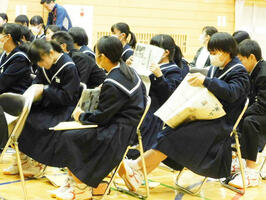 講演会の前には、各自のいすに新聞を置いた。普段なかなか触れていないにもかかわらず、講演が始まるぎりぎりまで読む姿があった。講演中も新聞の構成や作り方に話題が行くと、新聞を開いて確認する生徒が何人もいた。2時間の授業の間に、生徒は新聞を何度も開き、新聞の良さや価値を知ったに違いなかった。
