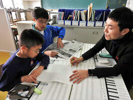昨年12月中旬、同会リーダーの9年生寺本健人(けんと)さん(15)の元に、合唱祭について新聞にしたいと3年生足立成(なる)君(9)が相談に来た。学級委員を通じてアンケートを取るという足立君に対し、寺本さんは「来年歌う側になる5、6年生には抱負を、合唱発表をした7、8年生には練習の取り組みを聞き取る項目にしたら?」「新聞には写真がほしいでしょ。校長先生が撮影してたから聞いてみる?」と助言。新聞づくりの経験がない足立君に、実際の新聞を広げながら文字の配置や見出しの役割について分かりやすく説明した。