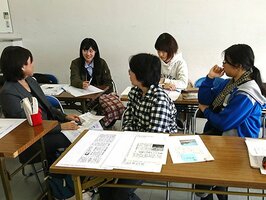 写真は昨年度、岐阜新聞報道部の記者を講師に迎えてのディスカッションの様子です。この授業では、講師が女性問題や環境問題等の複数の新聞記事を手がかりにして、課題と複数の捉え方を整理させ、学生の興味関心に沿ったグループでのディスカッションを行いました。学生にとっては、自らの考えを論理的に構成する際、新聞記事やコラム、社説の活用について大いに参考になっていました。