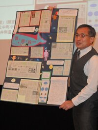 海洋プラスチック問題の記事の切り抜き作品を示した古家さんは「小学4年生が記事を読んで、実際にプラスチックのリサイクル工場を見学し話を聞いて、ぼくたち一人一人の努力と工夫が必要だと提案している」と、主体的、対話的で深い学びへ導いた新聞の力を力説。「子どもたちは感性を働かせた思いを基に学びに向かい、チョーク&トークの授業ではなく、新たな問いのある授業ができた。新聞を使う授業がいい」と断言した。