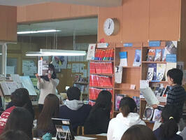 授業全般は教員が主導するが、後半の探究レポートの書き方については司書が担当をした。そこでは、レポートを書くにあたり、参考文献の探し方やメディアリテラシーについて話をした。情報の信頼度について、個人のSNSは低いことや、情報の新しさと確実さは相反することなどを説明し、また信頼度の高い情報については、新聞や公官庁のウェブサイトなどをあげ、「一つの情報だけでなく、違う情報と比べることも必要」とレポート作成の方法について的確なアドバイスをしてもらった。