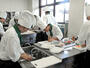 調理室の生徒らは、真っ白いシェフコートの襟元に緑のチーフ、長めの黒い前掛けというそろいの実習服。食材の切り方や加熱時間、調味料の加減などを確認し合いながら、手慣れた様子で魚をさばき、野菜を千切りにする音を響かせた。