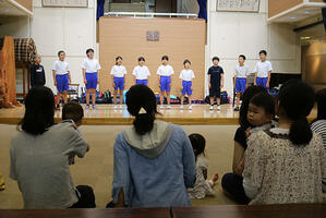 幅広い層の村民と交流できることも宿泊研修の強みの一つ。この日、児童は今年5月に導入されたばかりの移動販売車で昼食を購入したり、温泉施設「しらみずの湯」で入浴するなど、会館付近を周遊。当初は予定されていなかったが、子育て教室に訪れた親子らの前で合唱も披露した。会館を管理する村教育委員会の新谷さゆりさん(47)=同村御母衣=は「さまざまな目的で集まった村民との交流の場ができている」と歓迎した。