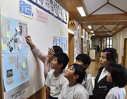 「英語教育」では、6年生17人が修学旅行先の京都と奈良で村のジュニア観光大使として白川郷観光マップ(前年度8年生制作)を配り、外国人観光客に英語で世界遺産・合掌集落など白川郷の魅力をPRした。