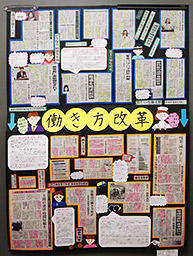 数ある作品の中で私が注目したのは「働き方改革」と「輝く女性が日本を変える」を見出しに据えた作品である。前者の取り組んだきっかけにはこうある。「入院しているときに議員のパワハラの録音や過労死が報道されていました。身近なところでは、部活の練習日数が見直されるようになり、先生たちの働き方も注目されるようになってきたので、『働き方』に関連した記事に注目することにしました」