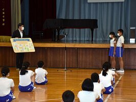 8月25日、同校でメッセージの伝達式があった。4~6年生が体育館に集まり、山内登市長からメッセージの貼り付けられたボードが児童代表に手渡された。山内市長は「災害や新型コロナに負けずに頑張って、というメッセージをもらった。福島市は約10年前の東日本大震災で被災した地域。東北地方の人たちは復興に努めている。私たちも災害に負けない下呂市をつくっていきたい」と話した。