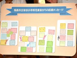 応援メッセージを寄せたのは福島市の笹谷小学校。送り先は岐阜県のほか、熊本県、佐賀県、長野県、山形県。豪雨のニュースを見た児童が「何かできることはないか」と考え、児童会の代表が7月下旬、全校に協力を呼び掛けた。励ましの言葉が書かれたカラフルなメッセージカードが集まると、台紙に貼って各県庁に送った。県内では、被害の大きかった小坂小に届けられることになった。