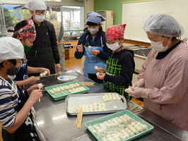 5年生は6月初旬に学校近くの田んぼで田植えを行い、草刈りをするなど米作りに励んだ。10月には稲刈りをして、五平餅のたれに使うクルミや落花生の収穫も体験し、五平餅の味をつくる地域の農業文化に理解を深めた。今月4、5日には山口五平餅名人会の住民を迎え、地元の伝統的な五平餅の作り方を教わった。三つの団子を刺した五平餅を炭火で上手に焼くための串打ちや、素材のうま味を引き出すたれの作り方を聞くなど、新米収穫を祝い、稲刈りを手伝った人に五平餅を振る舞っていた地元の伝統に触れた。