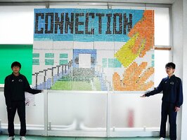 12月には、全校生徒201人を1~3年生の縦割りで5、6人ずつ36グループに分け、5046個のキャップを使ってアート作りに挑戦。グループごとに作品のパーツとなる板(縦約30センチ、横約45センチ)にキャップを両面テープで貼り付けた。3年生がリーダーとなり、各学年の生徒が話し合いながら作業を進めた。36枚のパーツを組み合わせてアートを完成させ、生徒玄関に飾り付けた。