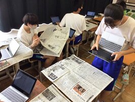 実践校2年目となる本年度は、1人1台のタブレット端末を活用。新聞記事をデジタルデータ化し、パワーポイントを使って要約したり、意見をまとめたりする力を養う。