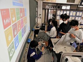 5月下旬。3年2組では1年間の探究活動のテーマを決めるため、身近な話題を記事から収集。生徒たちが当初、どんなニュースや出来事が17の目標に当てはまるか判断できないでいると、担任の前田大輝教諭(28)は、見出しに着目するよう助言。すると、県内自治体が新年度予算案で環境SDGsを推進する動きを報じる地域面や、自然保護と地域経済の発展を考える持続可能な観光をPRする広告紙面などを各自が選び、関心ある記事をタブレット端末で撮影した。