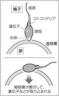 受精能獲得を終えた精子は卵を包むゼリー状の膜(透明帯)に頭部から侵入します=図=。精子の大きさは0・06ミリですが、卵はほぼ倍の1・1ミリあります。精子の頭にある尖体(せんたい)から卵の殻を溶かす酵素を出し、卵の透明帯を突き破って内側に侵入します。そして、精子は卵に横付けし、それぞれの細胞膜が癒合します。すると精子内の遺伝子を含む内容物が引き込まれ、精子と卵の二つの細胞が一つの細胞(受精卵)となります。このようにして、受精卵は父からの遺伝子と母からの遺伝子を併せ持つことになります。侵入した瞬間、卵の周りには受精膜というバリアが張られ、他の精子の侵入を防ぎます。