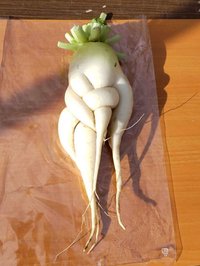 三つ編み「からまりダイコン」発見 岐阜・下呂市内の生産者から持ち込み