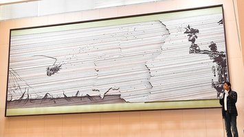 挾土秀平さん作品、岐阜県新庁舎1階に威容の土壁 「岐阜を一つに」鵜飼と高山祭描く