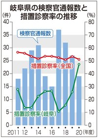検察官通報は2020年度、岐阜県では19件。うち措置診察につながったのは47・3%で、この年だけを見れば他県と大きな差はない。だが、過去10年間で全国平均は毎年50%前後で推移しているのに対し、岐阜では19年度以前は10~20%台が続く。