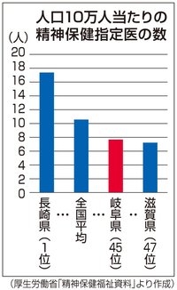 病床数にも相対的な不足がある。20年度の630調査によると、精神科病院のうち措置入院の受け入れができる病床の数は人口10万人当たりで全国平均の26・7人に対し、岐阜は7・2人と全国で2番目に低い。