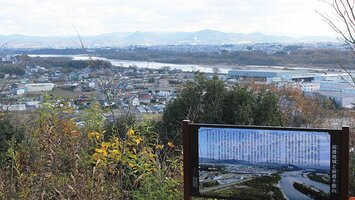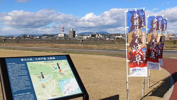 決戦の火ぶたは、上流の大井戸で切られた。合戦の空気を感じに可児市を訪れた。木曽川沿いの公園「日特スパークテックWKSパーク」。川を見下ろす一角に、戦いについて記した看板が立つ。この付近から幕府の東山道軍5万騎が、美濃加茂市側へ渡って突破。泰時率いる東海道軍も大豆戸を渡り、東と南から挟み撃ち。防衛ラインを破られた朝廷軍は総崩れとなった。