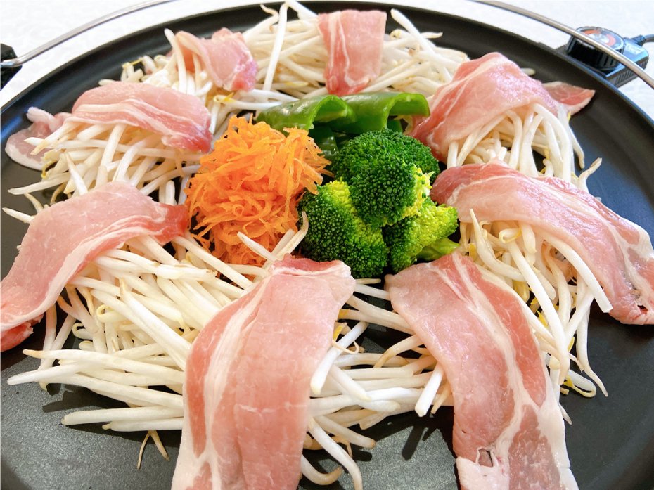 (1)電源を入れたホットプレートの上にリング状にもやしを盛り付けて、内側にお好みの野菜を並べる。
