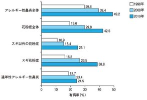 アレルギー症状は体のあらゆる臓器で起きる可能性があり、一つのアレルギー症状があると次々に異なるアレルギー疾患が発症または悪化する場合があります。例えば鼻炎の治療が不十分だとぜんそくが悪化しやすいことが知られています。アレルギー疾患は最近増加傾向にあるため=図=、花粉症からアレルギー症状が広がらないように注意しましょう。