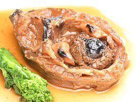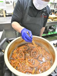 うろこを取り、輪切りにした身をまず素焼き。砂糖、濃い口しょうゆ、みりん、地場の醸造元が作るヤマコノの「調味の素」も少々加え、コトコトと鍋で8時間煮ると骨まで軟らかに。千切りのショウガを散らしてできあがり。12月末から4月の間に提供する。「冬場は皮と身の間の脂がとろけるようになり、おいしい」。一切れ850円で、持ち帰りもできる。