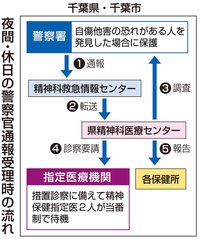 一方、千葉の県市が警察官通報として受理するのは保護を伴う案件に限った。発見通報を受理しない代わりに保健所への相談として受け付け、得られた情報を基に後日対応するよう変えた。診察不要の決定は減少し、警察官通報数に占める診察に至った数の割合(措置診察率)は11年度の22・2%から21年度には80・8%に上昇している。