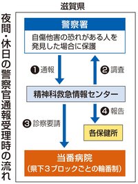 滋賀は09年、精神保健福祉士や保健師といった「専門職」と呼ばれる職員がいる福祉センター内に、夜間や休日に対応する情報センターを設置した。県内を3ブロックに分け、各ブロック内の医療機関が順番に対応する輪番制を活用。各ブロックの当番病院は原則、病床と指定医を確保する仕組みだ。当番病院は週ごとに変わるため、特定の病院に負担が集中することが回避された。