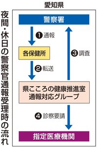 愛知県は15年、改善に動き出す。各保健所の担当者らを交えワーキンググループを組み、「保健所が病院に電話で個別に照会するため、精神保健指定医の確保に時間がかかる」といった課題を明確化。通報受理や調整の専用窓口を設け、対応を迅速にするなどの方向性を固めていった。