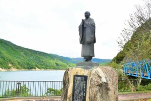 高山市荘川町中野の県天然記念物荘川桜の脇に立つ威厳に満ちた僧侶像。飛騨に浄土真宗を広めた嘉念坊善俊で、通説では9代後の明教の兄教信が内ケ島氏に討ち取られた三島将監とされる。