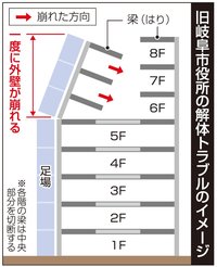 旧庁舎解体トラブル「工程に問題」岐阜市と業者認める 同業者「なぜ、理解できない」 社会 政治・行政 2023年3月10日 07:58 解体工事が中断した岐阜市旧本庁舎。写真左側(南側)3層の壁と梁の一部が内側に倒れた=9日午前10時57分、同市今沢町 岐阜市役所旧本庁舎の解体工事で発... 残り1110文字(全文:1127文字) この記事をお読みいただくには「デジタルプラン」または「宅配+デジタルプラン」の会員登録が必要です。無料会員の方はログインしてマイページからコース変更してください。デジタルプランまたは宅配+デジタルプランをご登録中の方はログインしてください。 岐阜新聞デジタル会員に登録すると 無料会員向け記事が読める ニュースレターで最新情報が受け取れる デジタルプラン、宅配+デジタルプランなら Webオリジナルコンテンツが読める 紙面ビューアが読める チケットの先行発売に参加できる お得なクーポンが使える 新規登録ページ ログインページ トップ 岐阜のニュース 社会 旧庁舎解体トラブル「工程に問題」岐阜市と業者認める 同業者「なぜ、理解できない」 関連記事 旧庁舎解体中、3層同時に倒れる不適切事案 岐阜市「建物内側、問題ない」 柳ケ瀬「旧長崎屋」岐阜市が用地取得へ 広場整備向け建物解体 もうすぐ見納め、ソーラーアークの裏側 社名ロゴも外され、解体間近か 岐阜・安八町 岐阜市旧庁舎跡地はオープンスペース、民設民営で長期活用 旧南庁舎はスケジュール遅れ 岐阜県内各地で積雪、飛騨市神岡町では25センチ 岐阜市、今季一番の寒さ おすすめ記事 【名将流儀】センター返しこそ真理 岐阜大会安打数記録チームをどう育てたか 太田郁夫さん【ぎふ高校野球】 勤務先の高校トイレで盗撮容疑、40代教諭を逮捕 岐阜羽島署 岐阜県内各地で積雪、飛騨市神岡町では25センチ 岐阜市、今季一番の寒さ 国政に物おじせぬ言動【岐阜市長2期目 柴橋正直氏の現在地】(上)政治家として