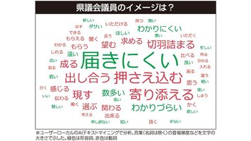 名詞を除いて解析したところ「届きにくい」「わかりづらい」が頻出した。瑞穂市の男性会社員(69)は「県議は遠い存在」と指摘。市町村議が身近な一方、県議の仕事、役割は有権者にとって明確でないとして不満を漏らした。羽島郡岐南町の女性(40)は「何をやっているのか分からない中途半端な存在」と辛辣(しんらつ)で、有権者に寄り添うため、触れ合ったり、話し合ったりする場をより多く持つよう求めた。高山市の会社員(36)は「ある意味、県議は議員の中で一番身近でない。県庁所在地から遠く離れた場所で暮らしていると、県議会そのものを遠くに感じる」と印象をつづった。