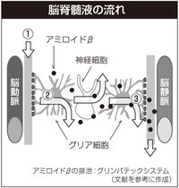 脳脊髄液は図のように、脳動脈の血管周囲腔(くう)に沿って脳深部に流入します(①)。そして、血管周囲に密着しているグリア細胞の水門から脳内に流入します(②)。その後、脳脊髄液の主流は、静脈側の血管周囲腔の方に向かいます(③)。グリア細胞とは脳内で、神経細胞や血管を支持固定している接着剤のような細胞です。この脳脊髄液の流れの過程で、アミロイドβは運搬され、排せつされる「水掃除」が行われるわけです。