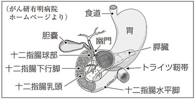 十二指腸には、胃で消化された食べ物に、消化酵素である胆汁や膵(すい)液が十二指腸内で分泌される乳頭部があります。十二指腸がんは乳頭部がんと、それ以外の十二指腸粘膜から発生する非乳頭部がんに大別されます。