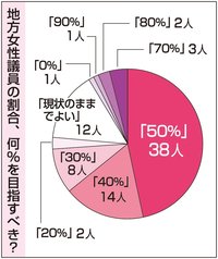 次いで多かったのは14人の「40%」。50代のパート女性は「女性に限らず、いろいろな立場の人の意見をニュートラルに受け止め、問題を解決できたらいい」と広く議会に多様性を求めた。