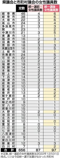 今回の統一選を終えて、県内の女性ゼロ議会は坂祝町を含む5市町、女性が1人だけの議会は12市町村で、選挙前と数は変わらなかった。今年は女性議員がいない加茂郡川辺町、七宗町のほか女性議員が1人だけの安八郡輪之内、安八町、本巣郡北方町、加茂郡八百津町で町議選があり、立候補の状況や有権者の選択が注目される。