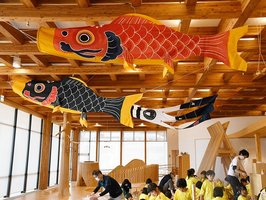 木製おもちゃ、頭上に郡上本染こいのぼり…子どもの楽園 ぎふ木遊館