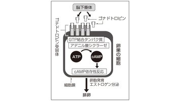月経が始まると次の月経に備えて脳下垂体からゴナドトロピンという排卵指令のホルモンが分泌され始めます。テレビの例でいうと、電波が送信されます。この電波は血流に乗って遠く離れた卵巣に到達します。電波であるゴナドトロピンは卵巣細胞内に入れません。その代わり細胞表面にあるアンテナ(受容体)と結合します。すると、細胞膜の構造が変わりアデノシン三リン酸(ATP)が細胞内でサイクリックAMP(cAMP)という情報伝達物質に変換されます=図=。つまり細胞膜を介して、細胞の外と中で情報交換が行われます。